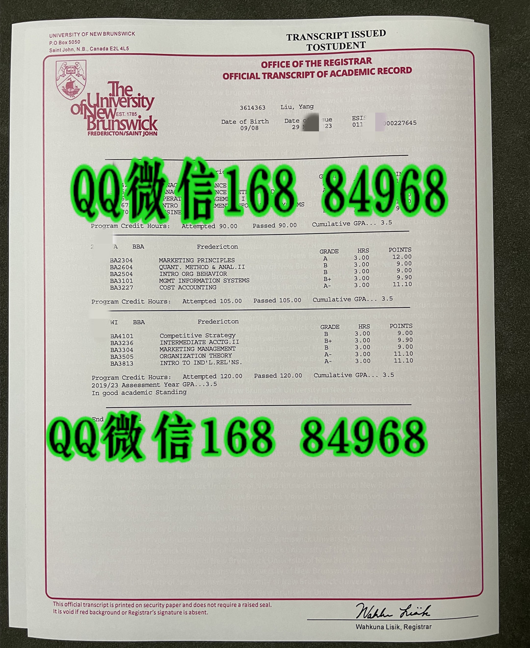 加拿大纽布伦斯威克大学成绩单,University of New Brunswick transcript