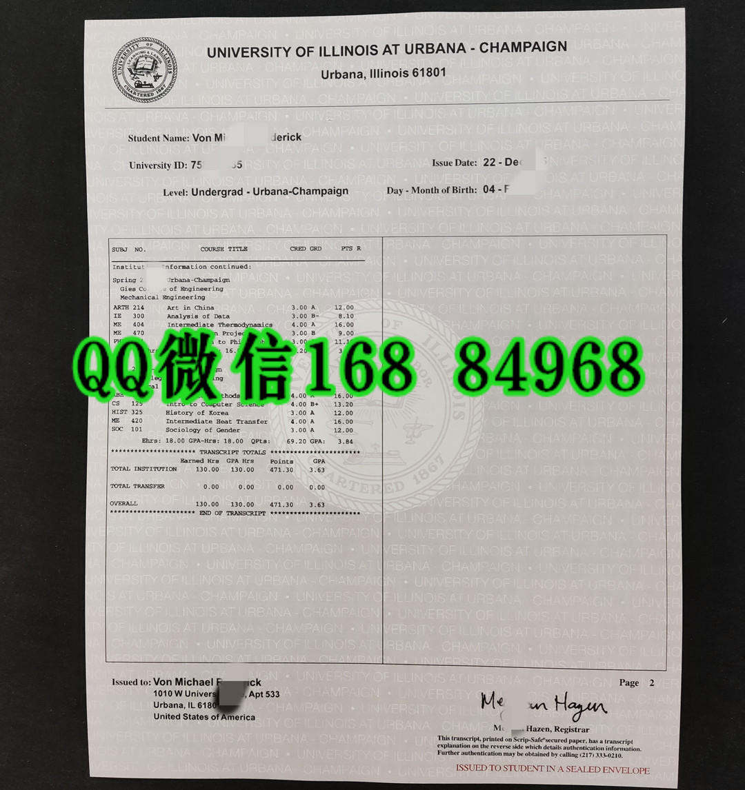 美国伊利诺伊大学香槟分校成绩单,University of Illinois Urbana-Champaign transcript