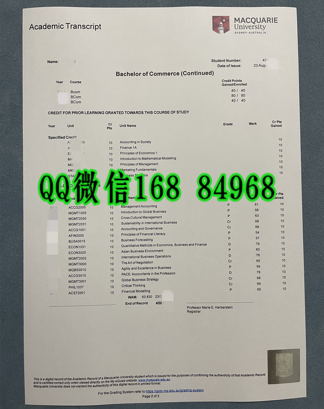 澳洲麦考瑞大学商学士学位成绩单,麦考瑞大学商业学学士课程成绩单Bachelor of Commerce transcript