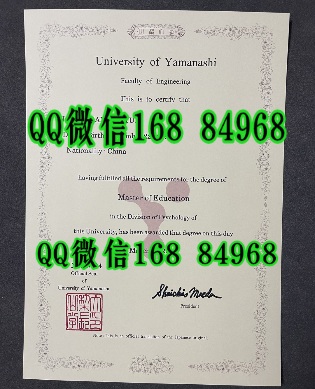 日本山梨大学毕业证,日本山梨大学学位证英文版本,日本山梨大学学位记