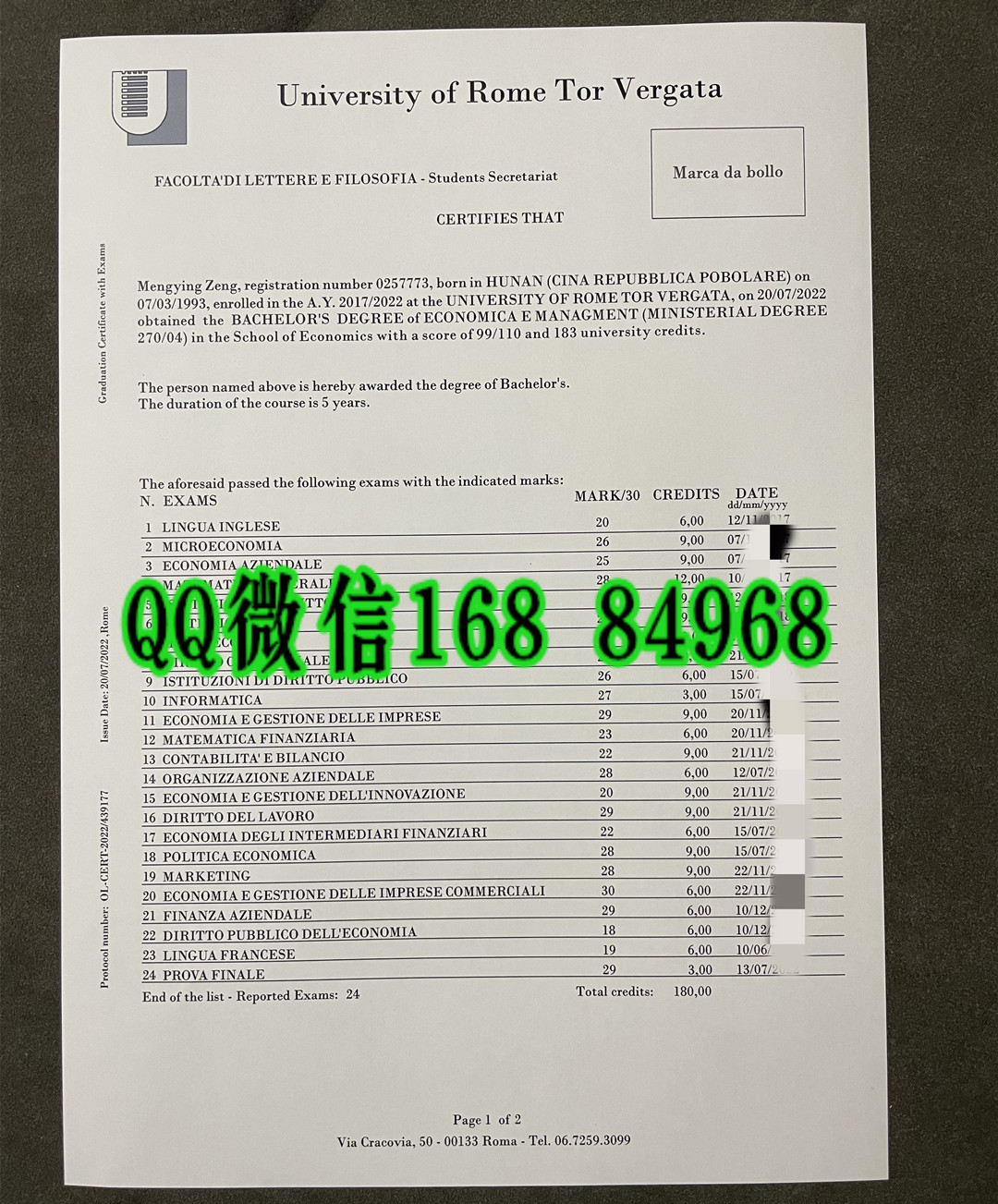 罗马第二大学成绩单,University of Rome Tor Vergata transcript